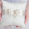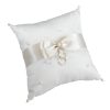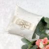 Dit elegante ringkussen is bedekt met ivoorsatijn en is versierd met gesprekkelde parels aan de voorkant en een paar grote en kleine parels op de hoeken. Een iets donkerder ivoor satijnen lint wikkelt zich rond de voorkant van het kussen en wordt geaccentueerd door een ivoren satijnen strik en een parel / strass decoratie