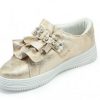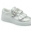 Comfortabel laag schoentje van glanzend textiel met een niet storend glittertje. Met zachte binnenvoering van jersey en pu-loopzooltje. Alle details stralen vrouwelijke charme uit: zacht glanzend met een glittertje, vrolijk dansende randjes op het blad. Het bandje met parels en strass sluit over de voet met een klittenbandje.